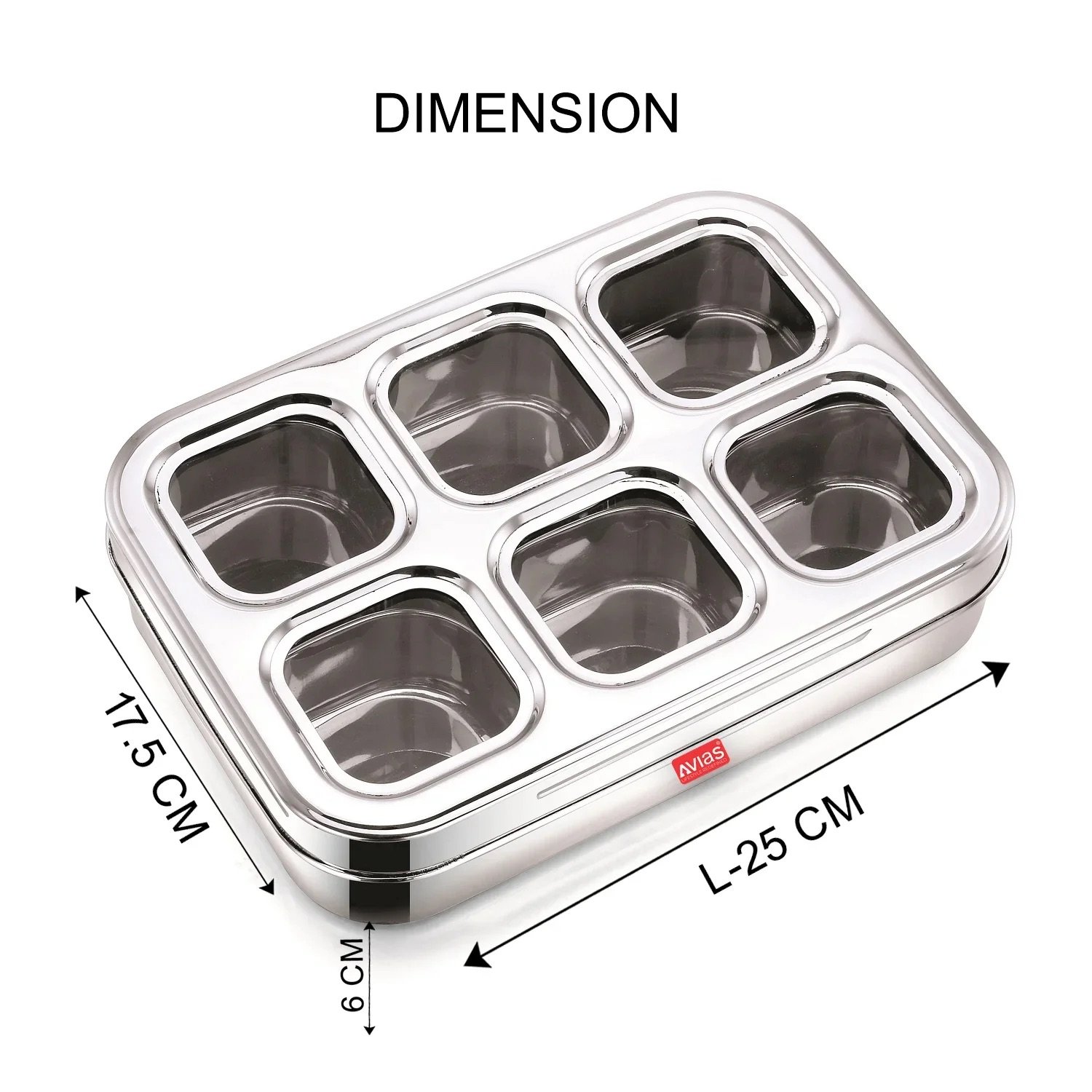 Enhance your kitchen organization with the AVIAS 6 Square Stainless Steel Spice Box, thoughtfully crafted for durability, elegance, and everyday convenience. Designed for modern households, this premium masala dani is made from heavy-gauge, food-grade stainless steel to ensure long-lasting performance and safe storage.