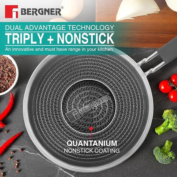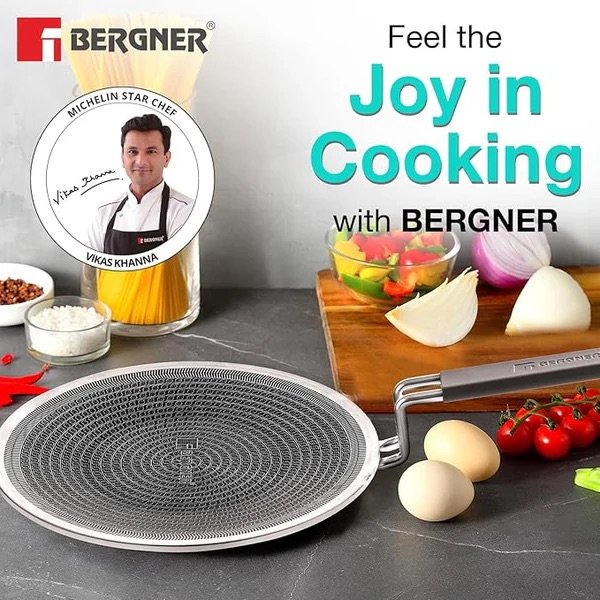 Experience superior everyday cooking with the Bergner Hi-Tech Tri-Ply Stainless Steel 26cm Roti Tawa, engineered for performance, durability, and healthier meals. Part of Bergner’s premium Hi-Tech Series, this roti tawa combines advanced tri-ply construction with innovative honeycomb mesh non-stick technology for exceptional cooking results.