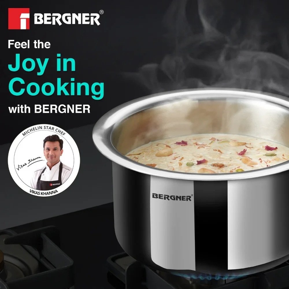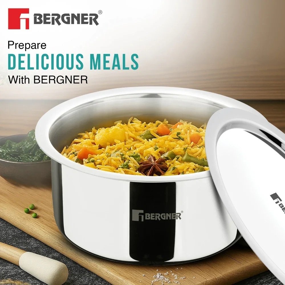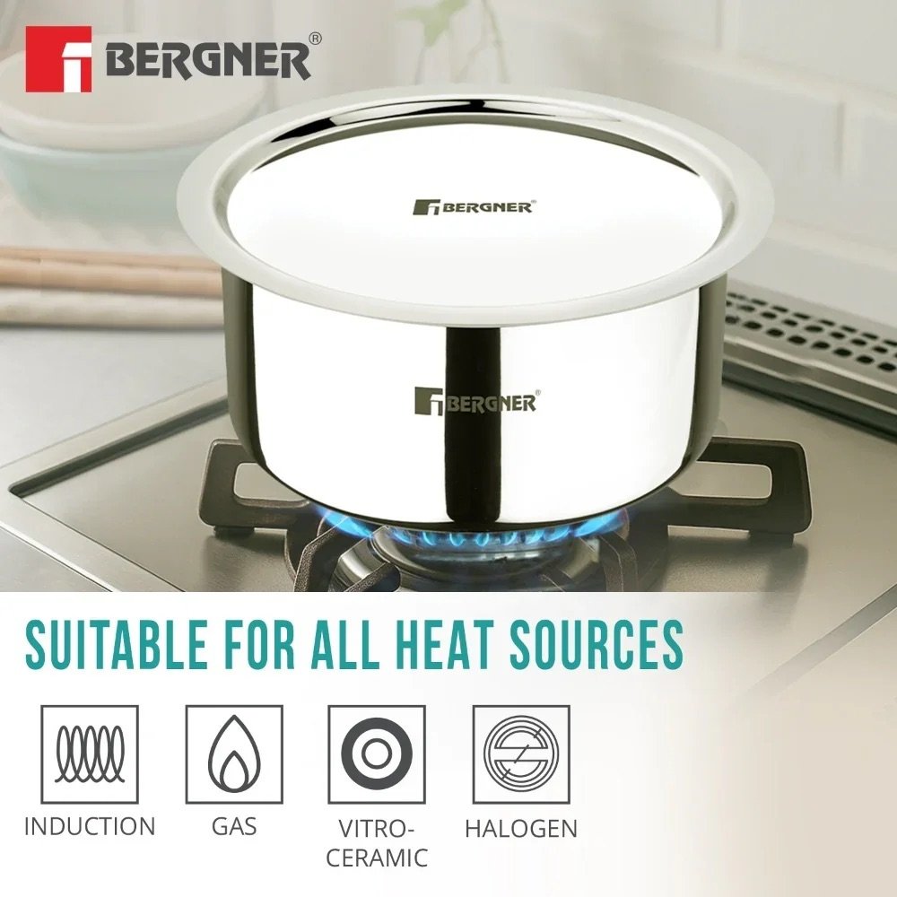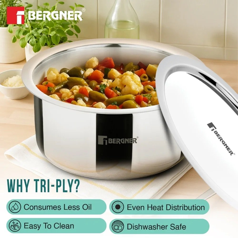 Upgrade your kitchen with the premium quality Bergner Argent TriPly Stainless Steel Tope, designed for healthy, efficient, and everyday cooking. Crafted with advanced TriPly construction, this durable steel patila ensures even heat distribution, faster cooking, and long-lasting performance. Its sleek mirror finish and sturdy stainless steel lid make it a reliable addition to any modern kitchen.