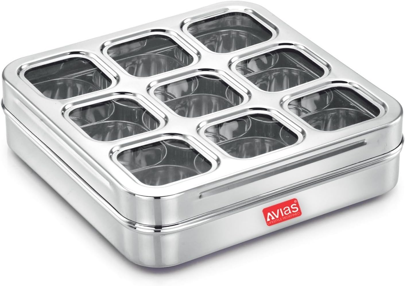 AVIAS Stainless Steel Square Spice Box – 9 Compartment Masala Dabba with See-Through Unbreakable Lid, Rust-Resistant Masala Organizer