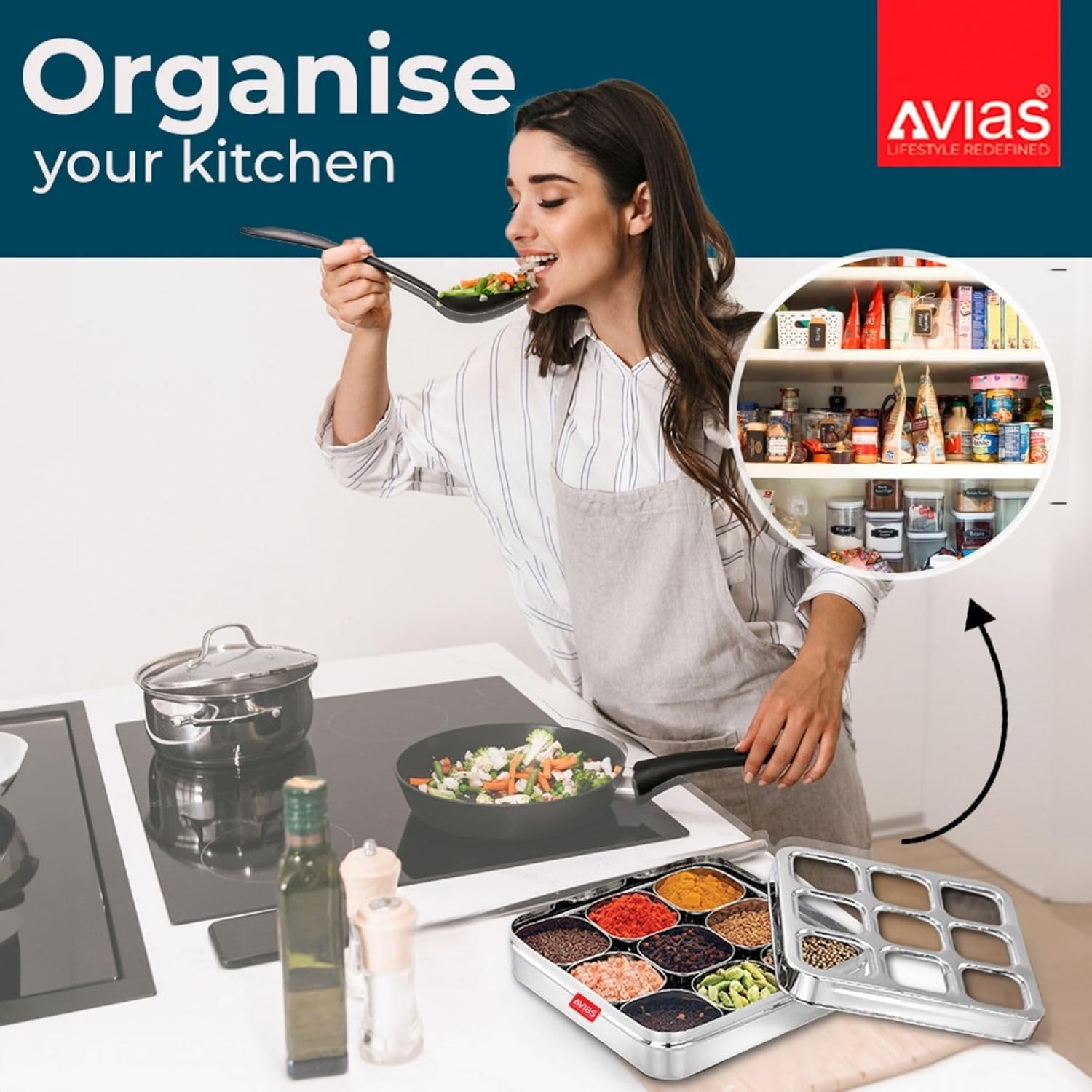 Perfect for traditional and modern kitchens alike, the AVIAS Stainless Steel Masala Box brings together durability, style, and convenience—helping you add authentic flavor to your food with ease.