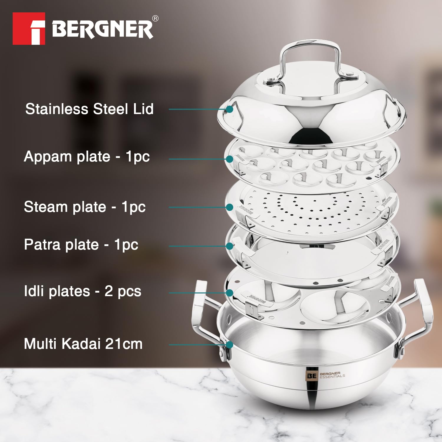 Bergner Essentials Triply Stainless Steel 21cm Multi Kadai – Induction-Compatible Multi-Use Cookware for Idli, Dhokla, Appam & More