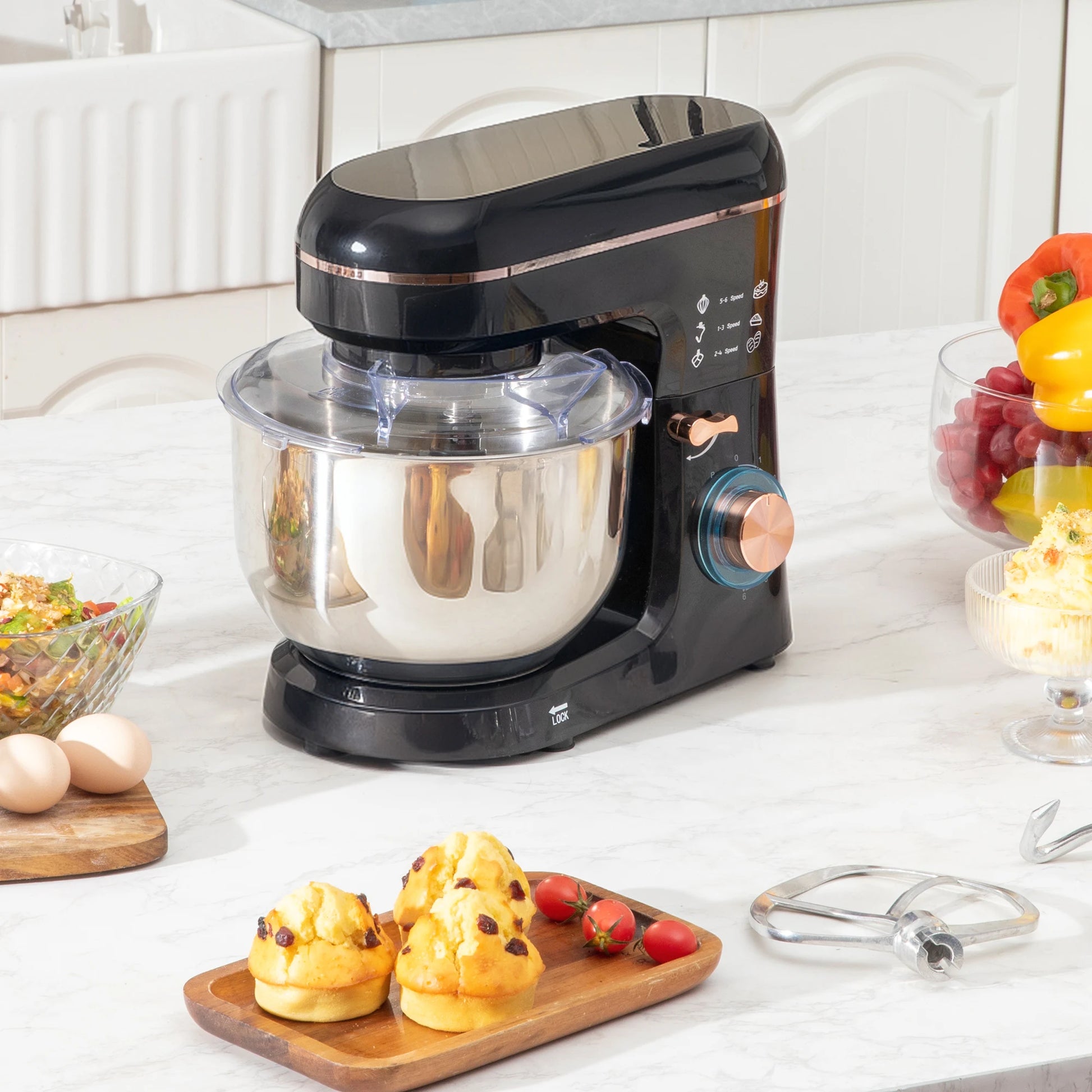 The HOMCOM Electric Stand Mixer is a versatile and powerful kitchen appliance designed to make food preparation effortless. With a large 5L capacity bowl, it is perfect for mixing, kneading, and whipping large batches of ingredients for cakes, bread, cookies, and more. The mixer comes equipped with a dough hook for smooth and consistent kneading, a whisk for fluffy whipped creams and meringues, and a beater for general mixing.